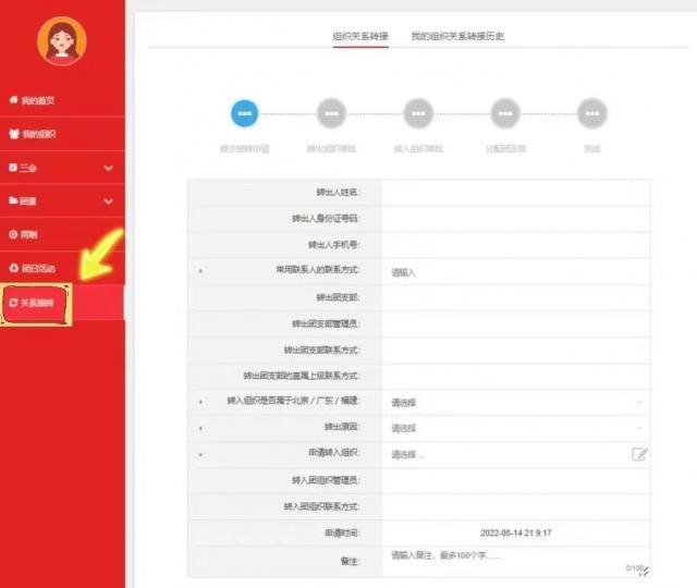 登录后点击界面左侧“关系转接”,点击“组织关系转接”选项,完整并且正确地填写页面的相关信息后点击“申请转入组织”(“转入组织”为新生所在班级团支部或所在学院新生临时团支部)后点击提交,等待团组织关系转接审批即可。