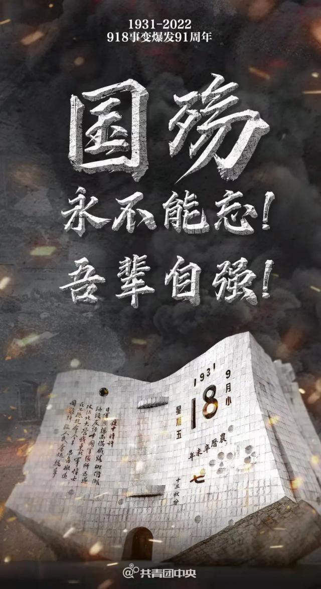 今天,纪念“九一八事变”的防空警报,昭示我们要时刻牢记:勿忘国耻,振兴中华。”