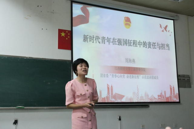 在宣讲会上,我校工商管理学院党委副书记周海燕,作为团省委“青春心向党 奋进新征程”示范宣讲团成员,围绕深入学习宣传贯彻习近平总书记重要讲话精神和团的十九大精神进行宣讲,领会党中央致词精神。她提出,本次讲话集中体现了习近平总书记对青年和青年工作的高度重视。她鼓励青年肩负起在强国征程中的责任与担当,积极践行“请党放心、强国有我”的青春誓言,努力成为能接得住历史接力棒、能在惊涛骇浪中不动摇的“强国一代”。大家纷纷表示,要牢记习近平总书记嘱托,坚定听党话、跟党走的政治信念,增强历史责任感和使命感,积极投身中国式现代化建设,在强国建设、民族复兴伟业中勇当先锋队、突击队。