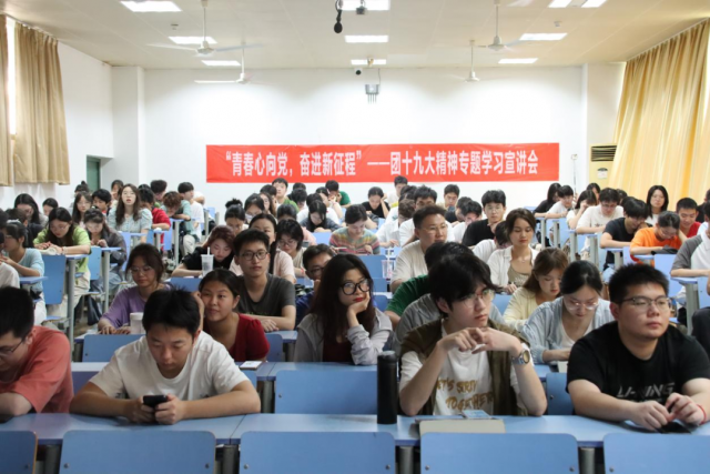 为认真学习宣传贯彻习近平总书记在同团中央新一届领导班子集体谈话时的重要讲话精神,落实党中央致词精神和团十九大部署,9月27日下午,我校在蛟桥园校区南区第一教学楼召开“青春心向党 奋进新征程”——团十九大精神专题学习宣讲会。