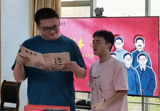 赵天睿带领研究生支教团成员沉浸式体验《新青年》《虎犊》两个剧本,从故事创作背景、历史依据等方面为研究生支教团成员进行讲解,并围绕剧本主持技巧进行了培训。