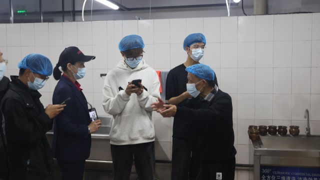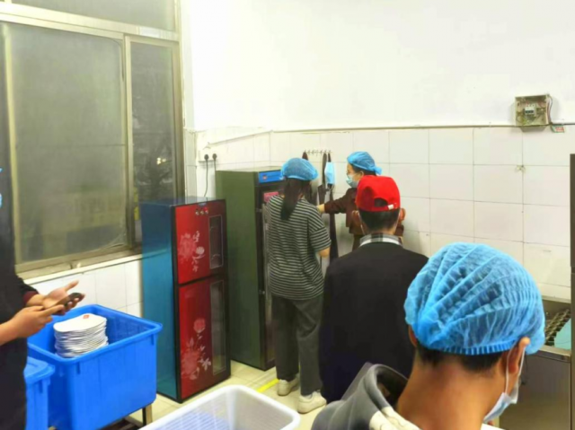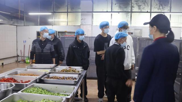 学生代表团走进了学校后厨,从食材的新鲜存储,到餐具的清洁消毒,从烹饪区的卫生状况,到调料的规范摆放。