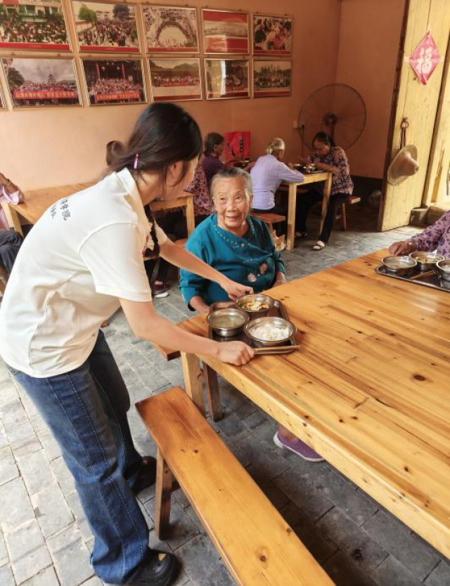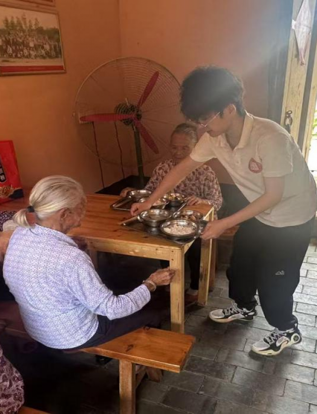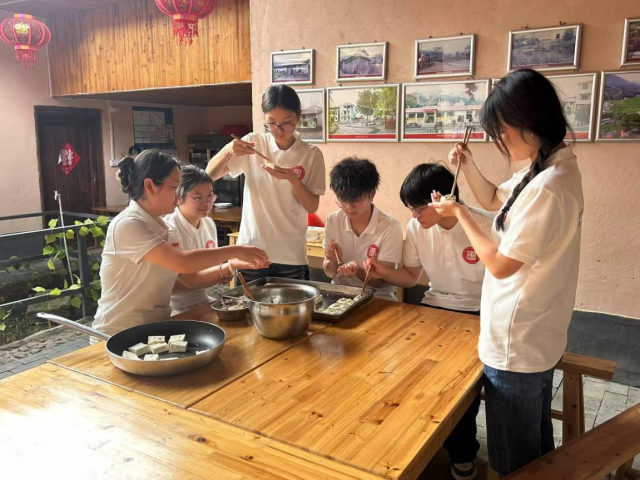 正值仲夏时节,队员们走进豆腐工坊和腐竹加工厂,在非遗技艺传承中感受产业振兴图景。凌晨五点,队员们跟随村民学习山泉泡豆、石磨出浆等传统工艺,在柴火慢熬的豆香中感悟老一辈手艺人匠心不渝的坚守。正午的幸福食堂里,暖意融融,队员们为老人们盛着饭、传递着碗筷,将行动不便的老人扶到座位上,陪他们唠家常。一碗热汤、一块豆腐、几段腐竹,在升腾的热气里,都成为了最实在的关怀。