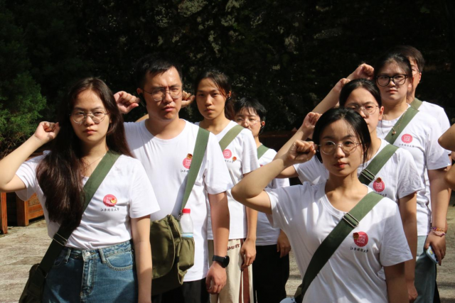 在吊唁大厅,镌刻在墙上的15744位烈士英名录无声诉说着那段烽火岁月。厅内那块无字的汉白玉碑,更让成员们肃然起敬,深感先烈们的崇高精神。随后,实践团在鲜红的团旗前,高举右拳,庄严重温入团誓词,铿锵誓言在山谷间回荡,激荡心灵。