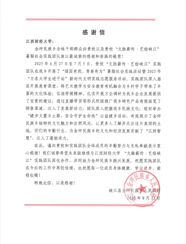 2025年暑期,我校青年学子怀抱赤子之心与青春理想,以文化浸润乡土、以科技赋能发展、以服务温暖民心,深入基层一线,足迹遍布田间地头、城镇社区。近日,一封封来自全国多地基层单位的感谢信如雪片般飞来,真挚的话语中满载对江财学子服务成效的高度肯定。这些信件不仅见证了“三下乡”活动的扎实成果,更彰显了新时代江财青年扎根大地、与时代同行的责任与担当。