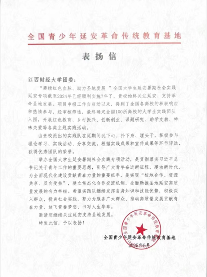 计算机与人工智能学院“延途有你”实践队在“赓续红色血脉、助力圣地发展”全国大学生延安暑期社会实践专项中,从百余支队伍中脱颖而出,荣获“优秀团队”称号。全国青少年延安革命传统教育基地来信表示,该活动是引导青年建功新时代、推动校地合作的重要平台,期待江财青年持续深入基层,贡献智慧力量。