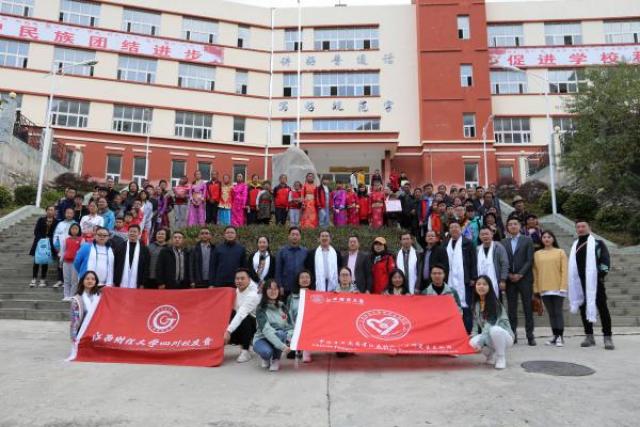 蒋金法一行在美兴中学参加了江西财经大学赴小金县慰问研究生支教团座谈会暨2019年四川校友会捐资助学仪式,城关二小和美兴中学学生献上哈达以表热烈欢迎。