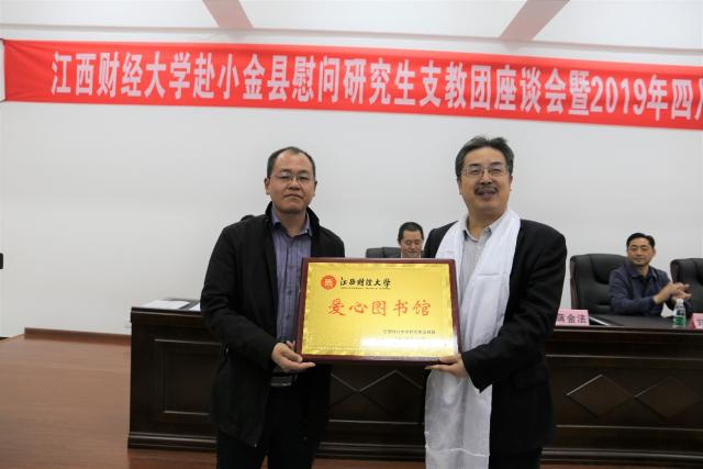 会议现场进行了“爱心图书馆”授牌仪式。蒋金法代表江西财经大学为小金县美兴中学“爱心图书馆”授牌。此前,研究生支教团联合我校青年志愿者协会在各学院及附属小学募捐的近4000本图书已全部到位。