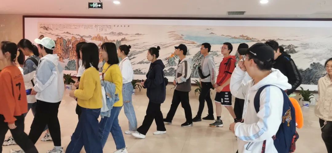 大家怀着好奇激动的心情踏入场馆一层,入目是壁画——《财园茂盛图》,画作暗藏“一九七八”四个字,展示了学校1978年复校至今的辉煌成就,表达了“大气磅礴绘山河,枝繁叶茂育英才”的美好寓意。