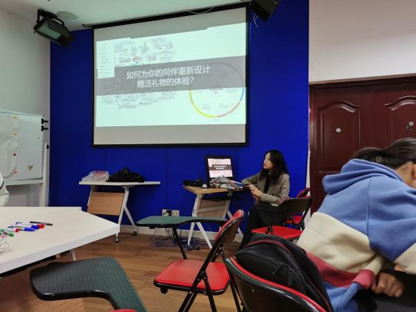 为让同学们深入地感受到设计思维的有趣性,现场举行了两个小游戏。首先是考验同学们的观察能力,两人为一组,先进行观察,再分别作出三个改变,再发现找出对方的不同,很好地活跃了现场的气氛。然后李璟璇介绍了如何定义问题,通过“如何为你的同伴重新设计赠送礼物的体验”小游戏,让大家都参与到设计中,体验设计的趣味,感受设计思维的有趣性,从而更好地把握设计思维。