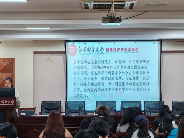国际经济与政治学院的宣讲会则聚焦“科技赋能食品安全”,展示了“互联网+”时代下的食品安全监管新模式,生动揭示食品安全不仅是基础民生问题,更是国家治理能力的重要体现。“大家看,这是部分省市推广的智能监管平台,通过手机APP就能实时查看餐厅后厨情况。”宣讲团成员一边演示一边讲解。该学院立足科学前沿,通过线上学习与线下研讨、传统治理与科技赋能等不同角度,引导学生深入思考如何通过技术创新提升食品安全治理效能,使每一个环节行为可溯、过程可查、责任可追,让食品安全看得见、管得着、查得清,为构建现代化食品安全治理体系建言献策。