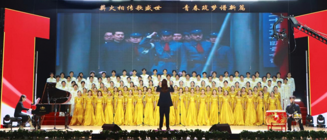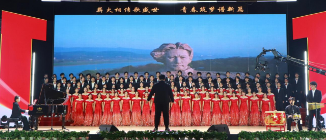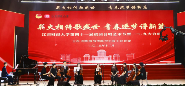 12月14日,“薪火相传歌盛世 青春逐梦谱新篇”——第四十一届校园合唱艺术节暨“一二·九”大合唱活动在我校蛟桥园校区大礼堂举行。学校副校长李春根、贺丹君,江西省纪委省监委驻江西财经大学纪检监察组组长、党委常委、校纪委书记黄海军,副校长谢花林,各单位党政负责人,教职工,离退休老同志和我校千余名师生代表现场欣赏演出。