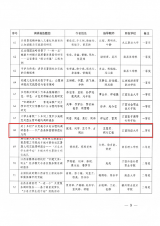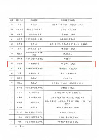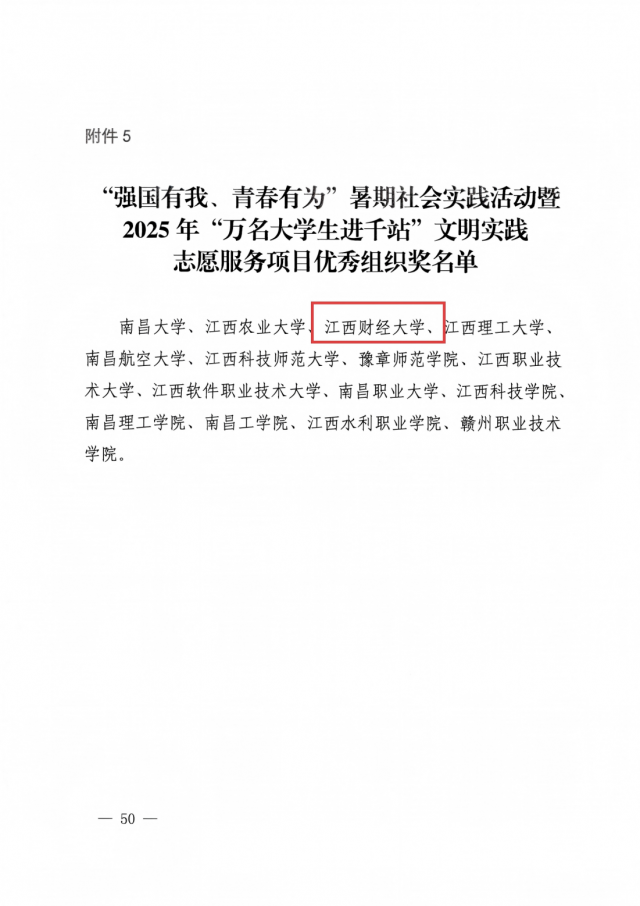 为深入学习贯彻习近平新时代中国特色社会主义思想,践行习近平总书记考察江西重要讲话精神,深入落实“新时代立德树人工程”,扎实推进“大思政课”综合改革试验区建设,推动优质资源下沉新时代文明实践中心(所、站),引导广大学生切身体验新时代伟大变革,2025年6月至9月,中共江西省委宣传部、江西省文明办、江西省教育厅、共青团江西省委联合开展“强国有我、青春有为”暑期社会实践活动暨2025年“万名大学生进千站”文明实践志愿服务行动。校团委联合各学院组织27支实践团队超百名师生,深入全省27个新时代文明实践中心(所、站),围绕理论学习、政策宣讲、安全教育、志愿服务、专项调研五大核心任务开展实践。各团队将专业知识与社会需求深度融合,期间累计完成政策宣讲10余场次,形成17篇高质量调研报告,制作专题短视频20余部,生动展现新时代乡村发展图景。活动有效引导青年学生在躬身实践中厚植家国情怀,彰显了江财学子“把论文写在祖国大地上”的责任担当。