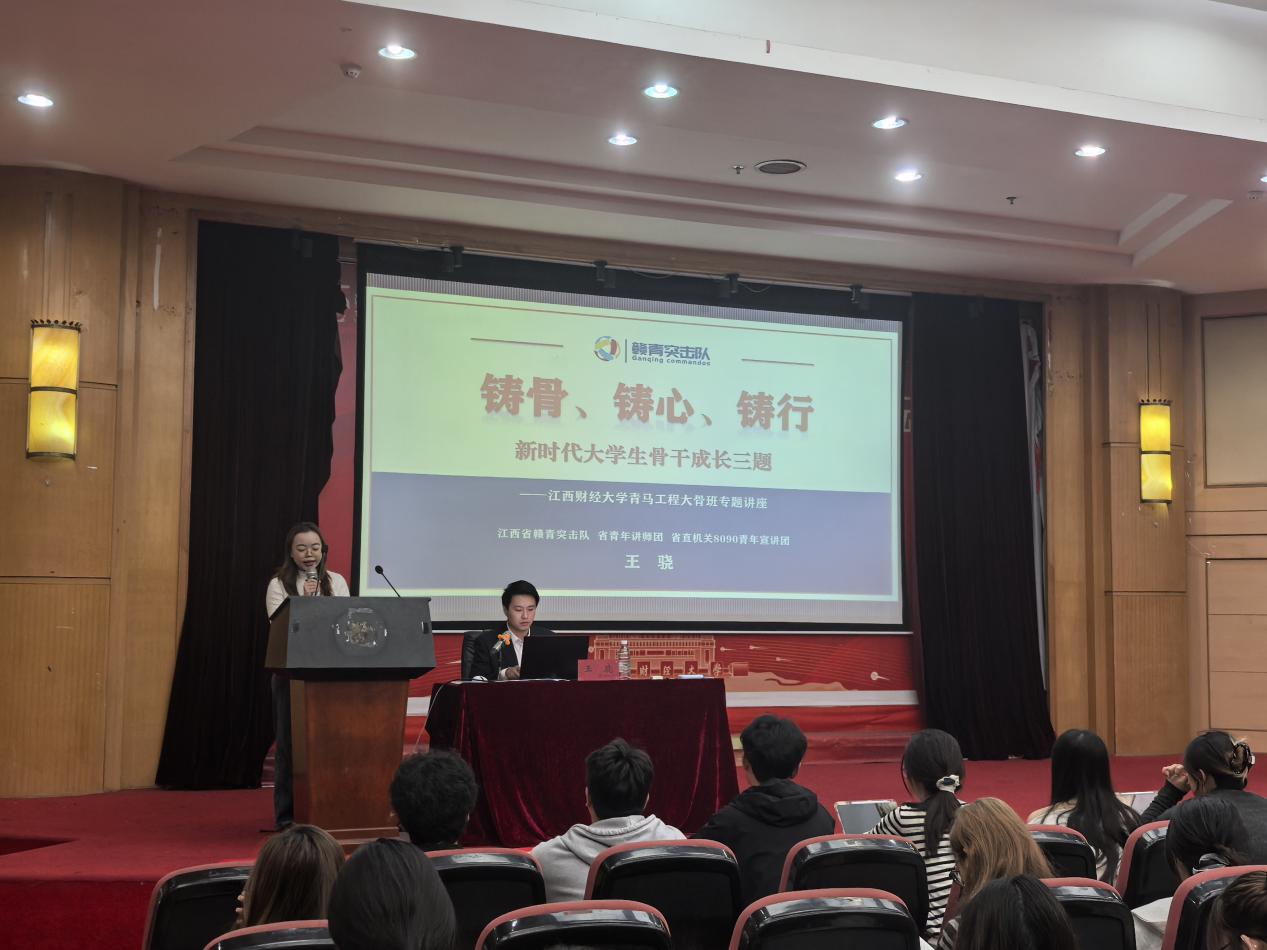 为深入推进新时代青年马克思主义者培养工程,强化大学生骨干思想引领与能力锤炼,4月12日下午,第十九期“青马工程·江财之星”大学生骨干培养班与第三十六期团学骨干培训班全体学员共同参加“铸骨、铸心、铸行”主题讲座。讲座特邀江西省赣青突击队、省青年讲师团、省直机关8090青年宣讲团成员王骁主讲,第十九期“青马工程·江财之星”大学生骨干培养班及第三十六期团学骨干培训班全体学员参加。