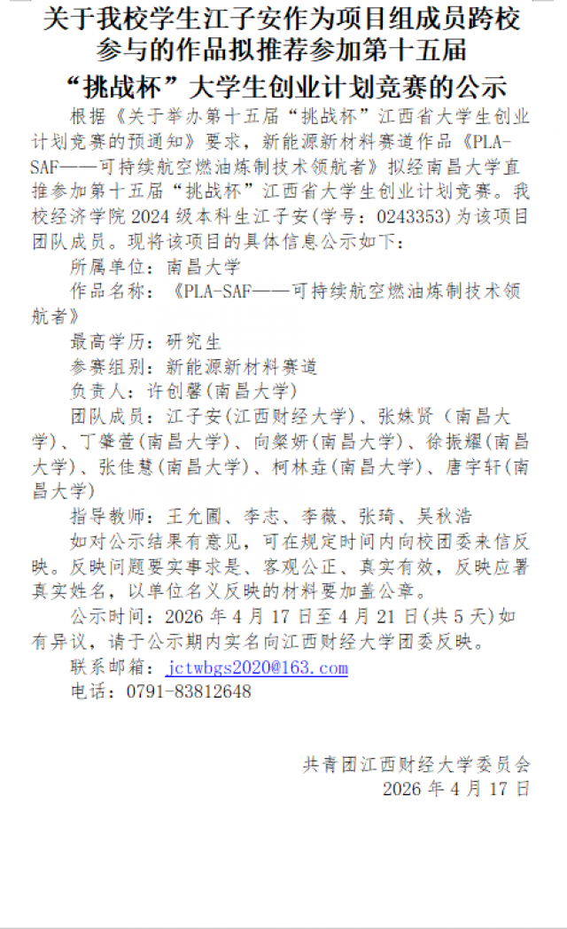 关于我校学生江子安作为项目组成员跨校参与的作品拟推荐参加第十五届 “挑战杯”大学生创业计划竞赛的公示