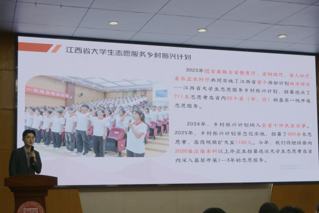 首先,西部计划江西省项目办从西部计划概念切入,重点讲述全国项目与地方项目(以江西省大学生志愿服务乡村振兴计划为例)的关系和相关政策保障,详细介绍招募流程、服务内容、保障机制等方面内容,对志愿者后续发展路径及相关享受政策做了全面介绍。此次宣讲为有志投身基层的青年扫清了疑虑、指明了方向,也让更多青年看见了扎根西部、服务基层的广阔舞台。这不仅是一次政策宣讲,更是一次青春感召,激励着更多学子以实干担当践行初心,在基层一线书写属于新时代青年的奋斗篇章。