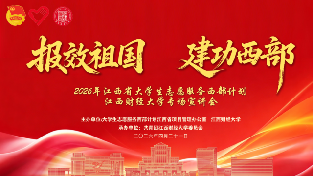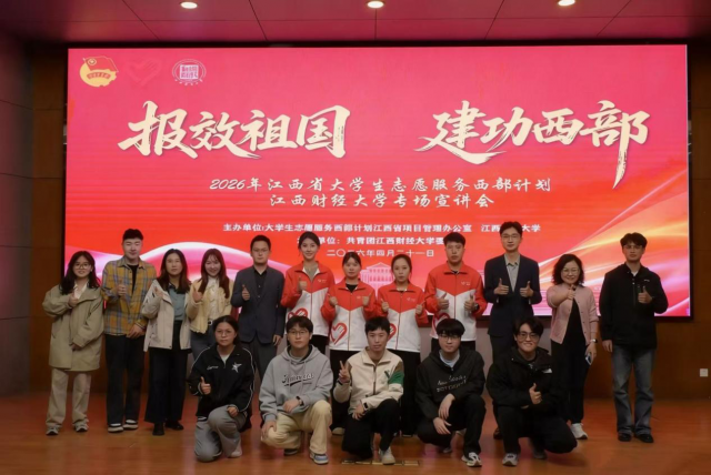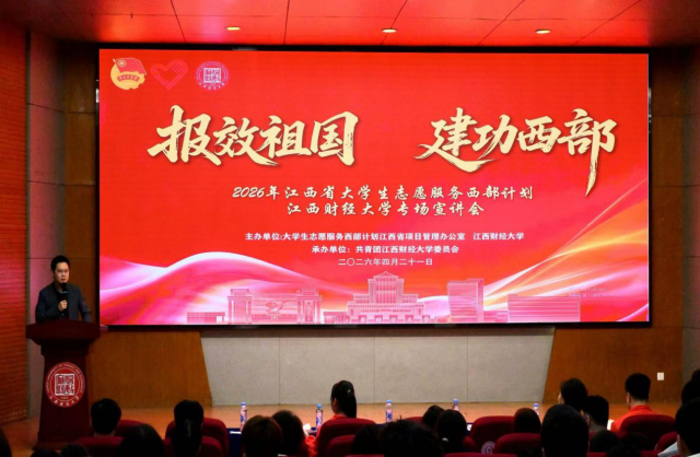 为引导青年学子响应国家号召,把青春奋斗融入时代征程。4月21日下午两点,我校于枫林园校区青云楼一楼报告厅举办2026年江西省大学生志愿服务西部计划宣讲会(江西财经大学专场),校团委书记王昊,校团委挂职副书记吕镇坤出席,校院两级团干部代表以及师生代表参加此次宣讲会。本次宣讲会汇聚政策解读与榜样分享,激励江财青年奔赴西部、扎根基层,在祖国和人民最需要的地方书写青春华章。